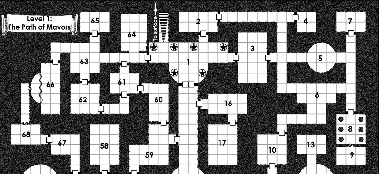 Now, as to what needs to be listed since the map displays certain information. I actually disagree with some others commenting in that I like when exits are listed in the key because I personally always forget to tell my players exits and the reminder within the key is quite helpful. I would also add that including directional arrows in addition to cardinal directions can be useful for reducing cognitive load with a price paid of only 3 characters each. Such things being listed in the key is especially useful if you don't include a mini-map on each spread that you can reference when also referencing the key.